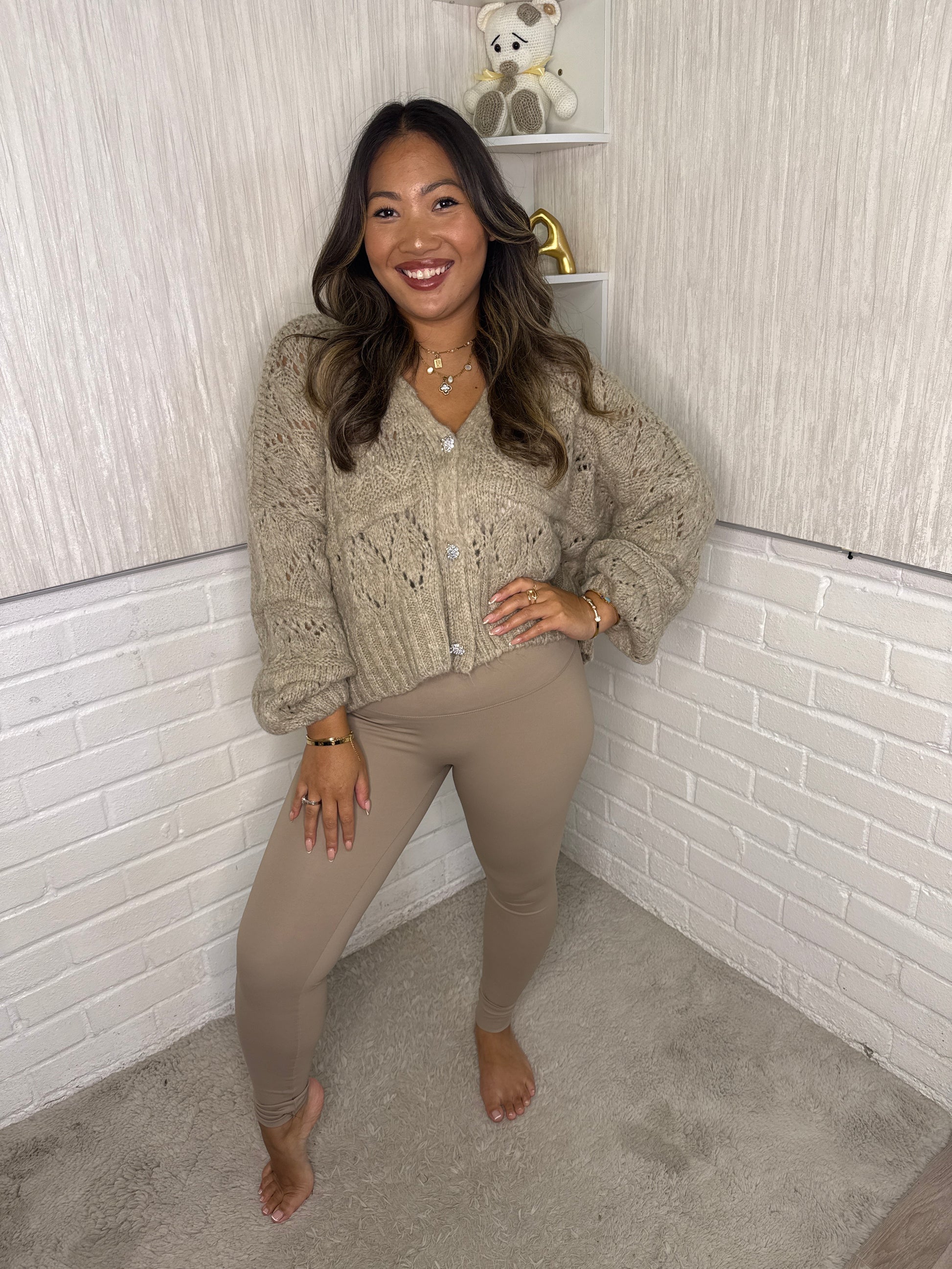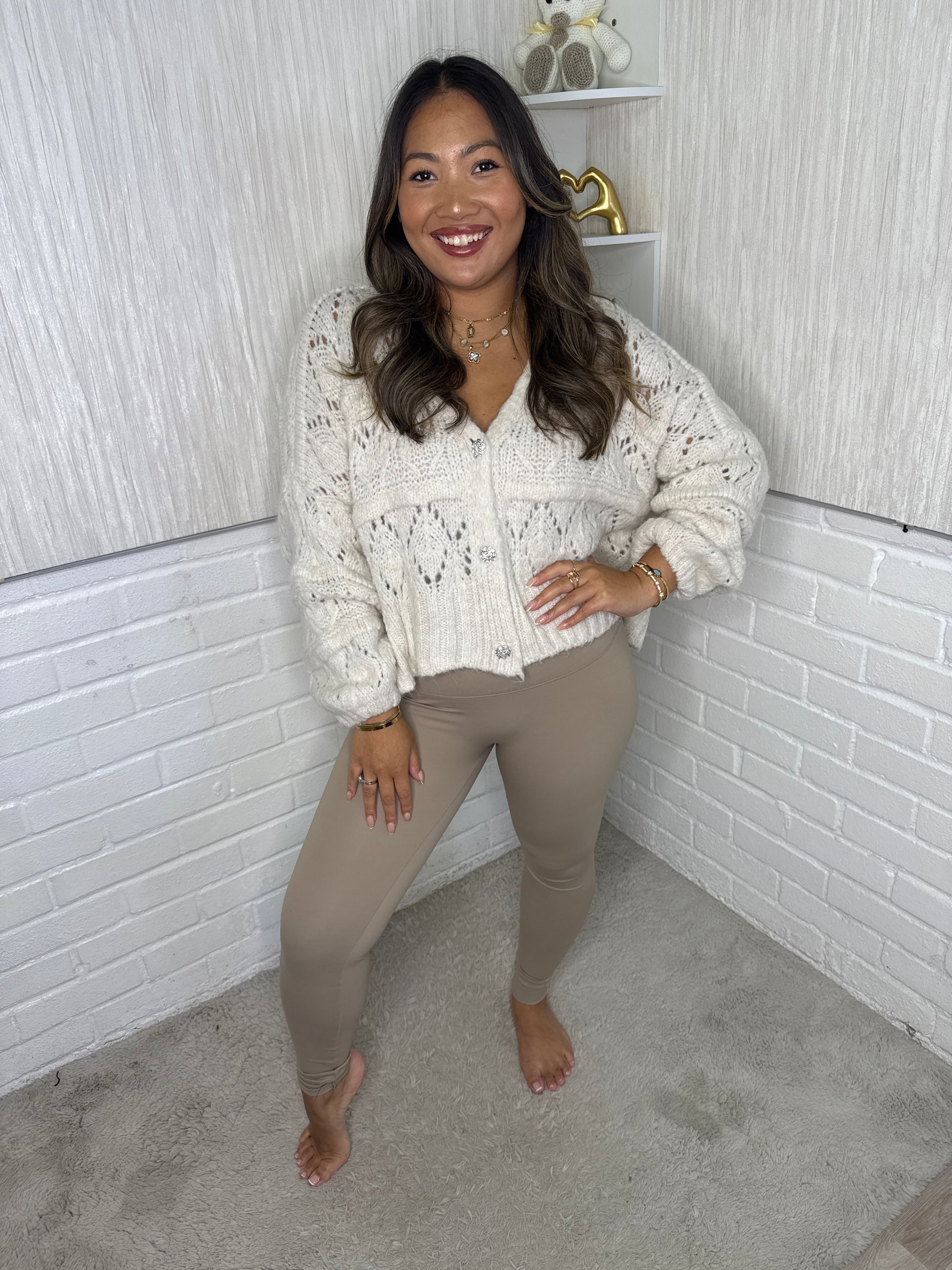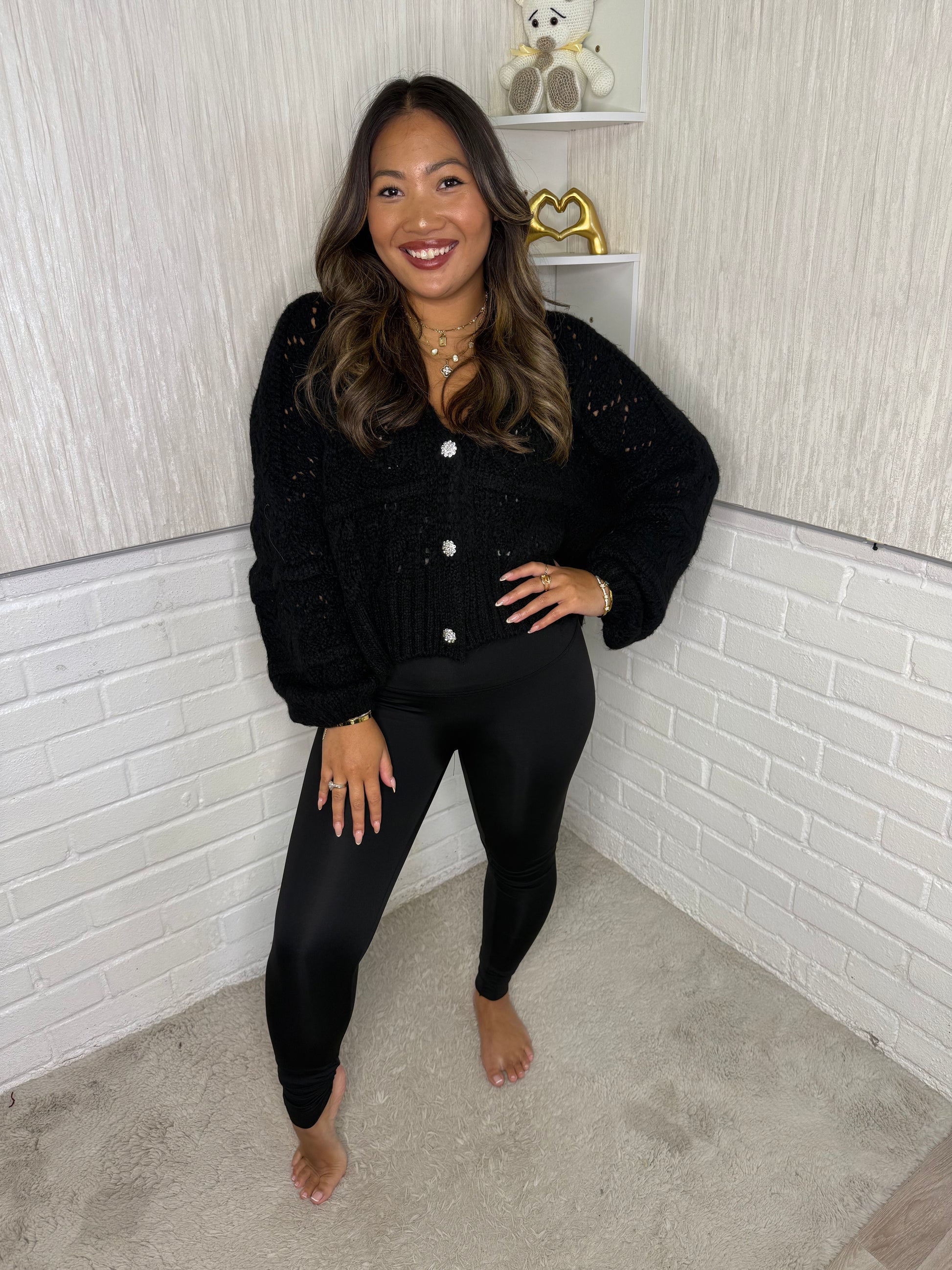 Introducing Crystal, the must-have addition to your wardrobe. This stunning quality knit cardigan features gold rhinestone buttons that add a touch of luxury to any outfit. Made with precision and expertise, you'll love the softness and durability of this versatile piece. Elevate your style with Crystal.