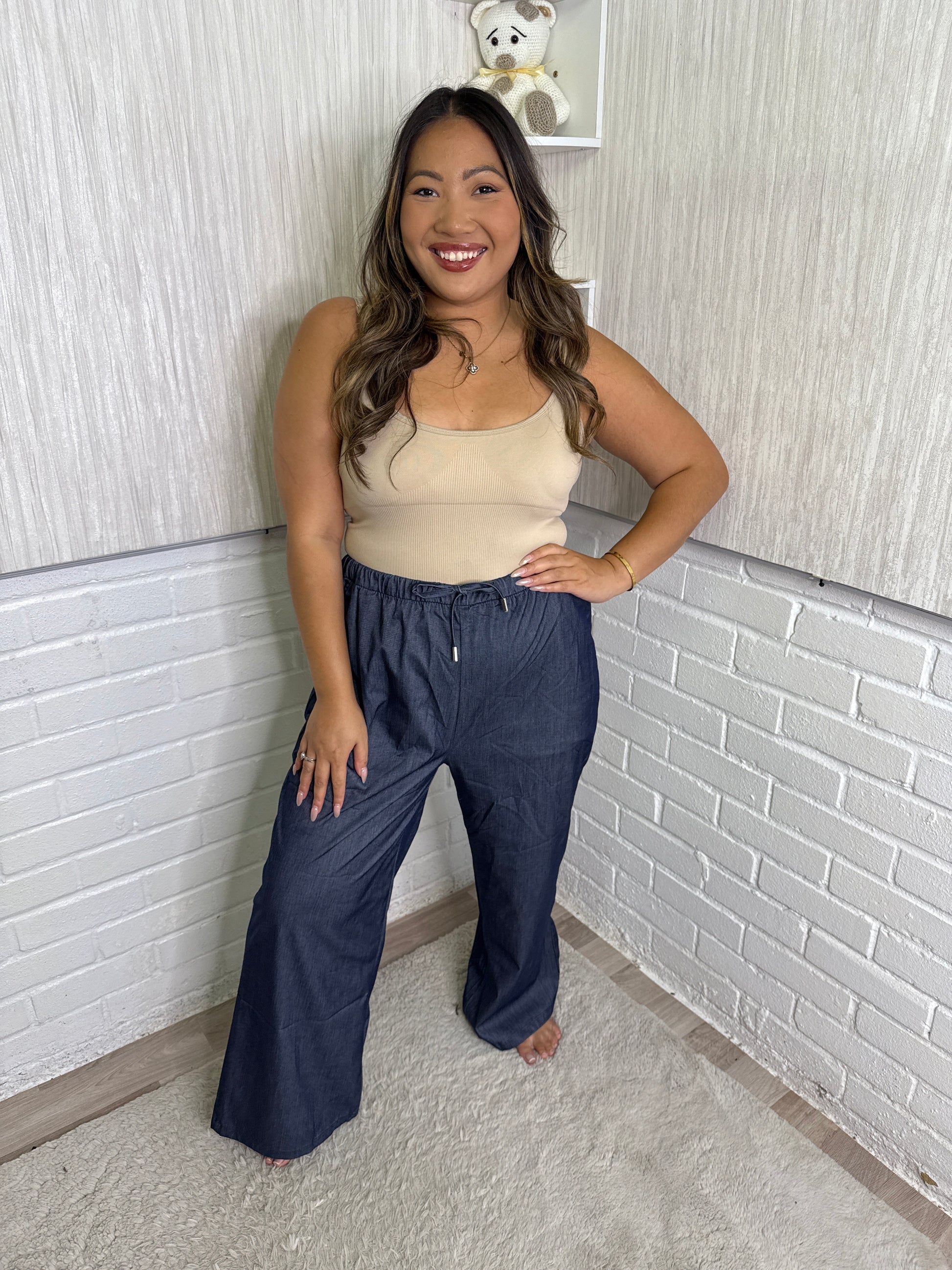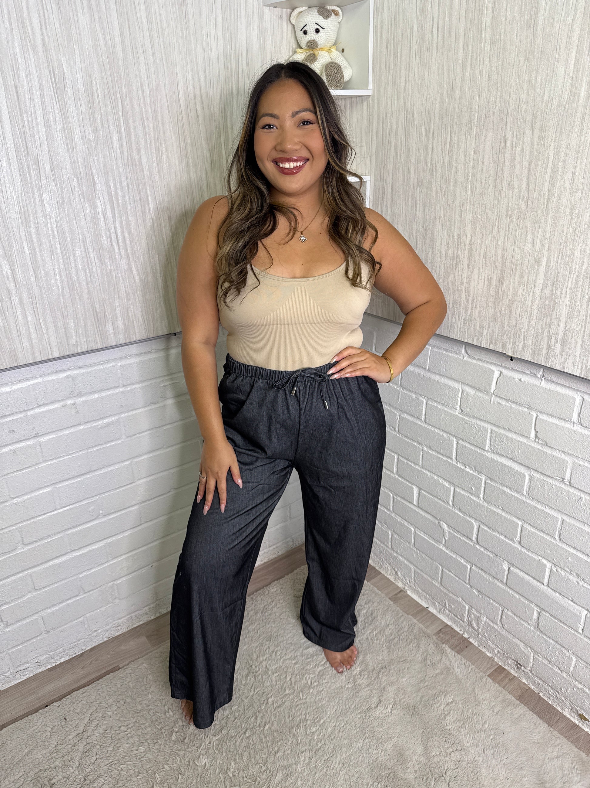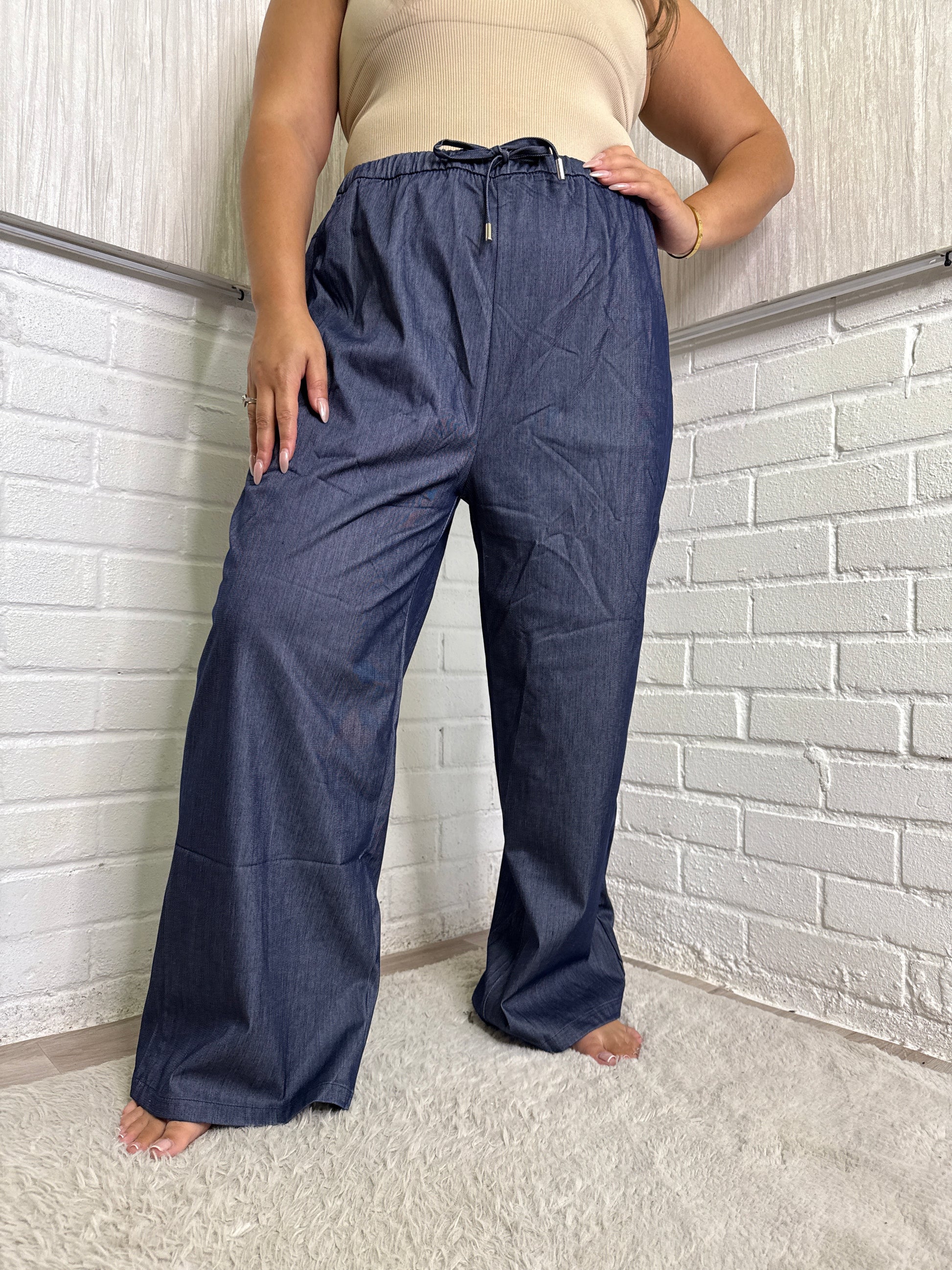 A lovely straight leg trouser with an elasticated waist real drawstring. Sized trousers (two sizes available) with high amounts of stretch and comfort. material 43% cotton 47 % viscose 10% Elastane.