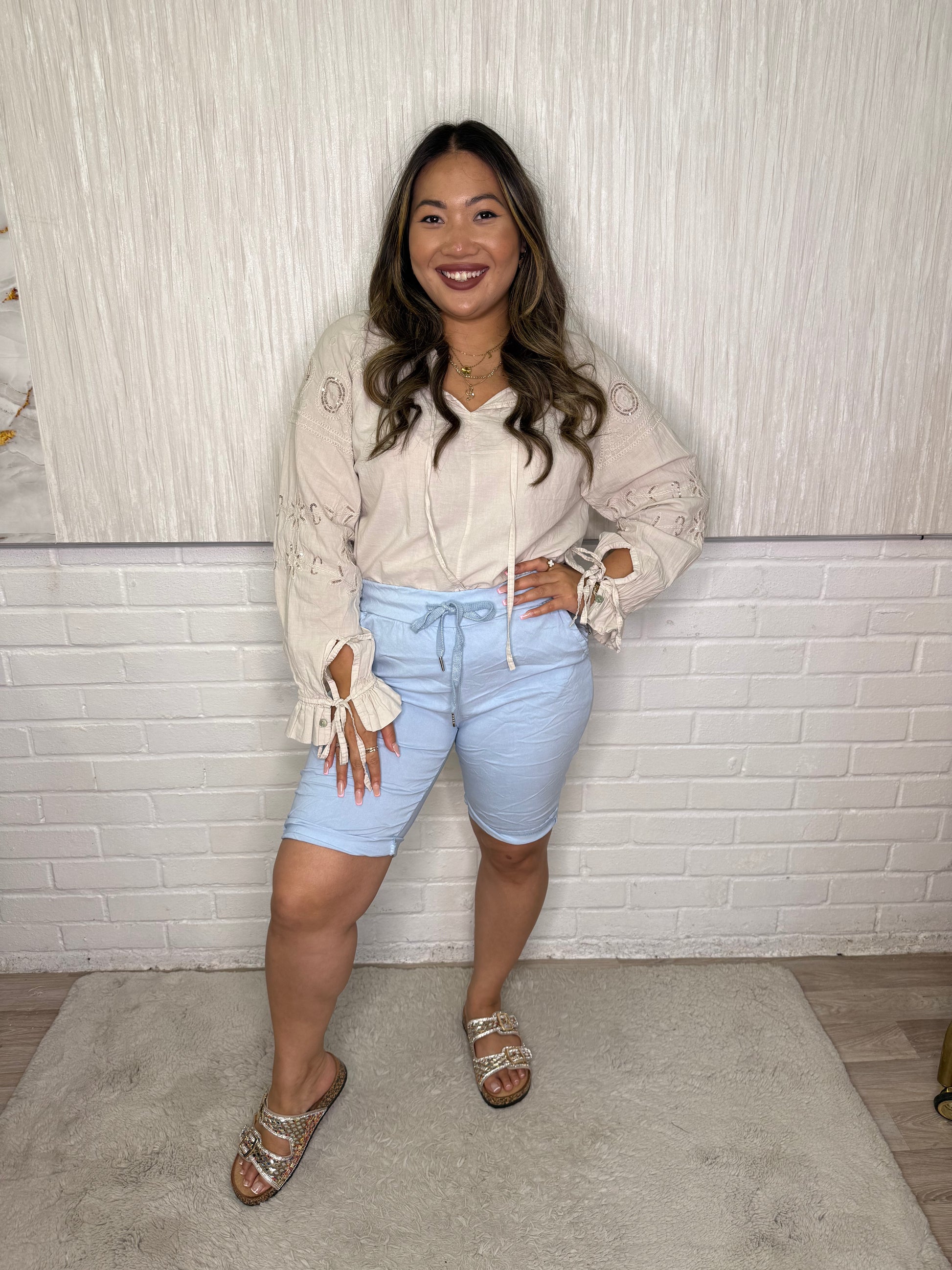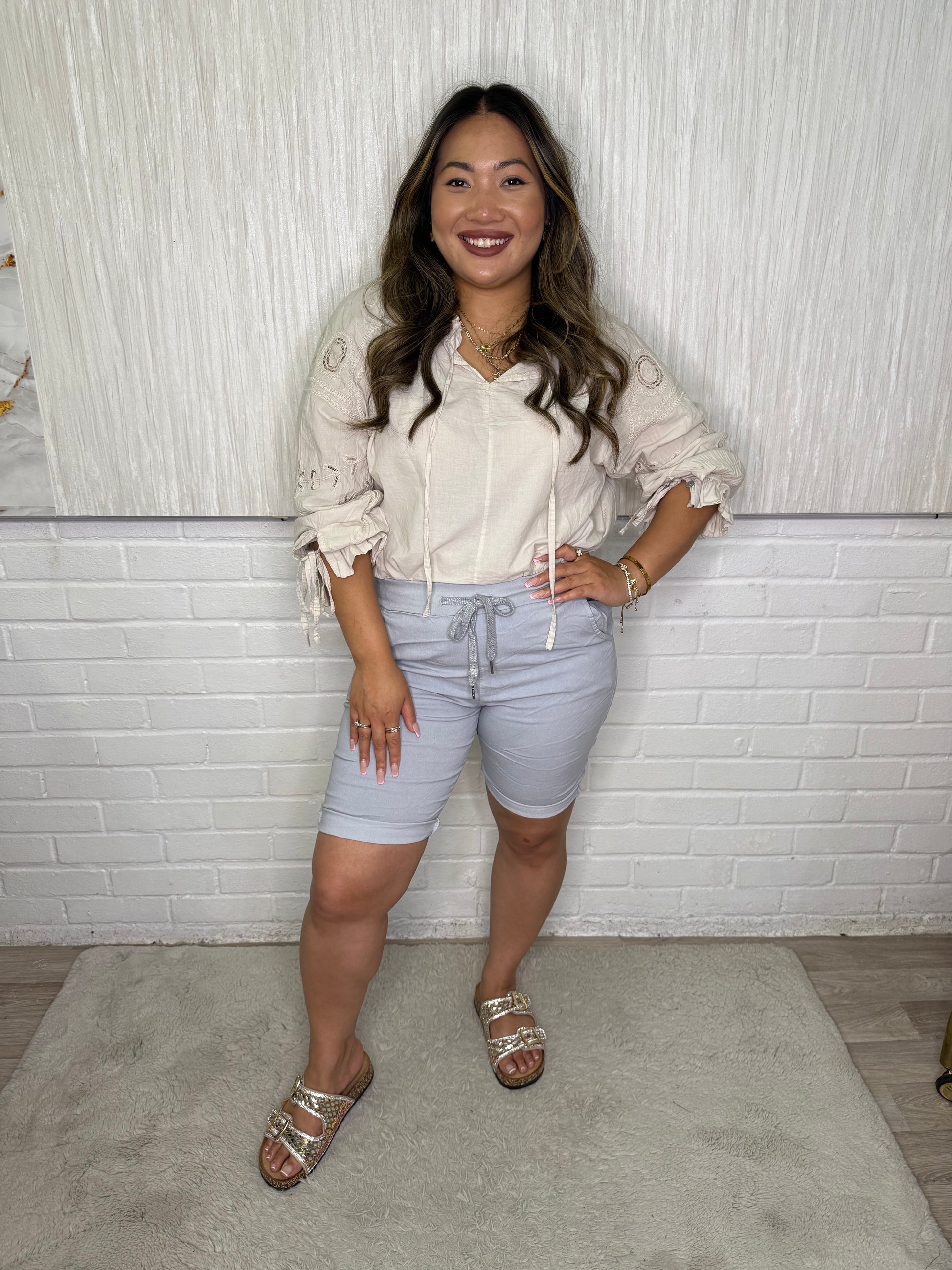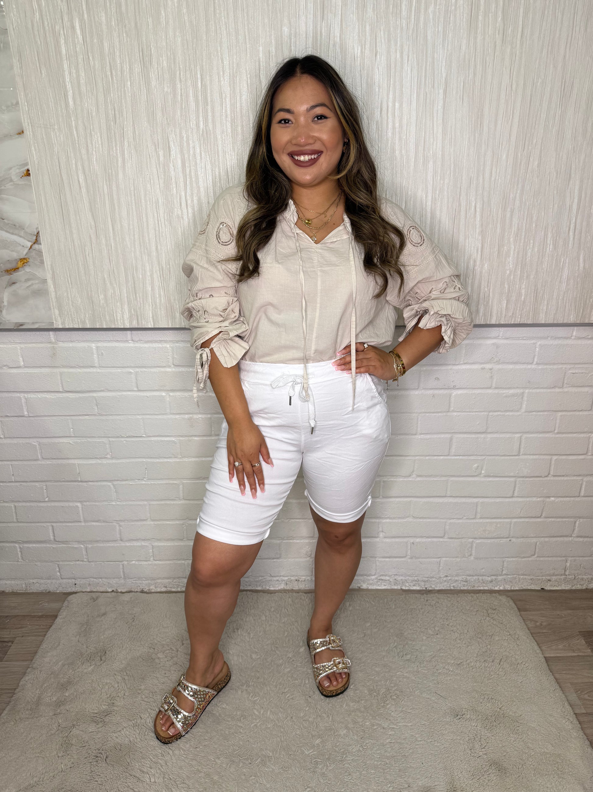 Mid Length Magic ShortsIntroducing Rae, the perfect solution for those who struggle with finding the right fit! Our Mid Length Magic Shorts come in sizes 10-18, ensuring a comfortable fit for a wide range of body types. Say goodbye to ill-fitting shorts and hello to effortless style and comfort.
