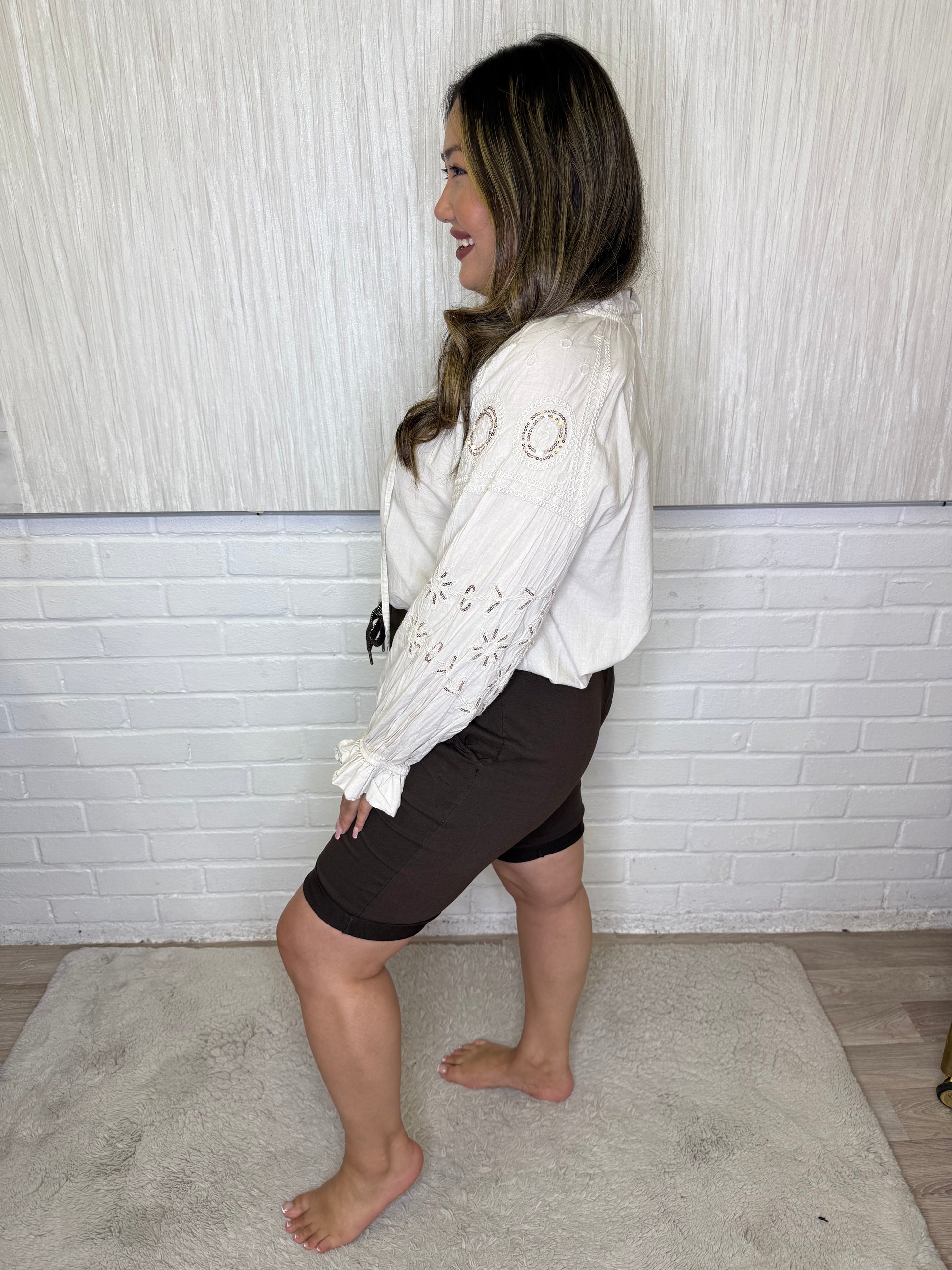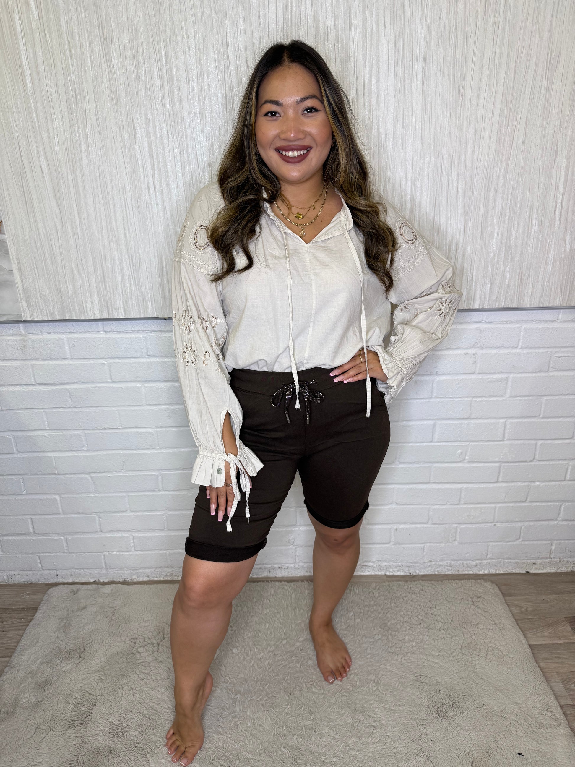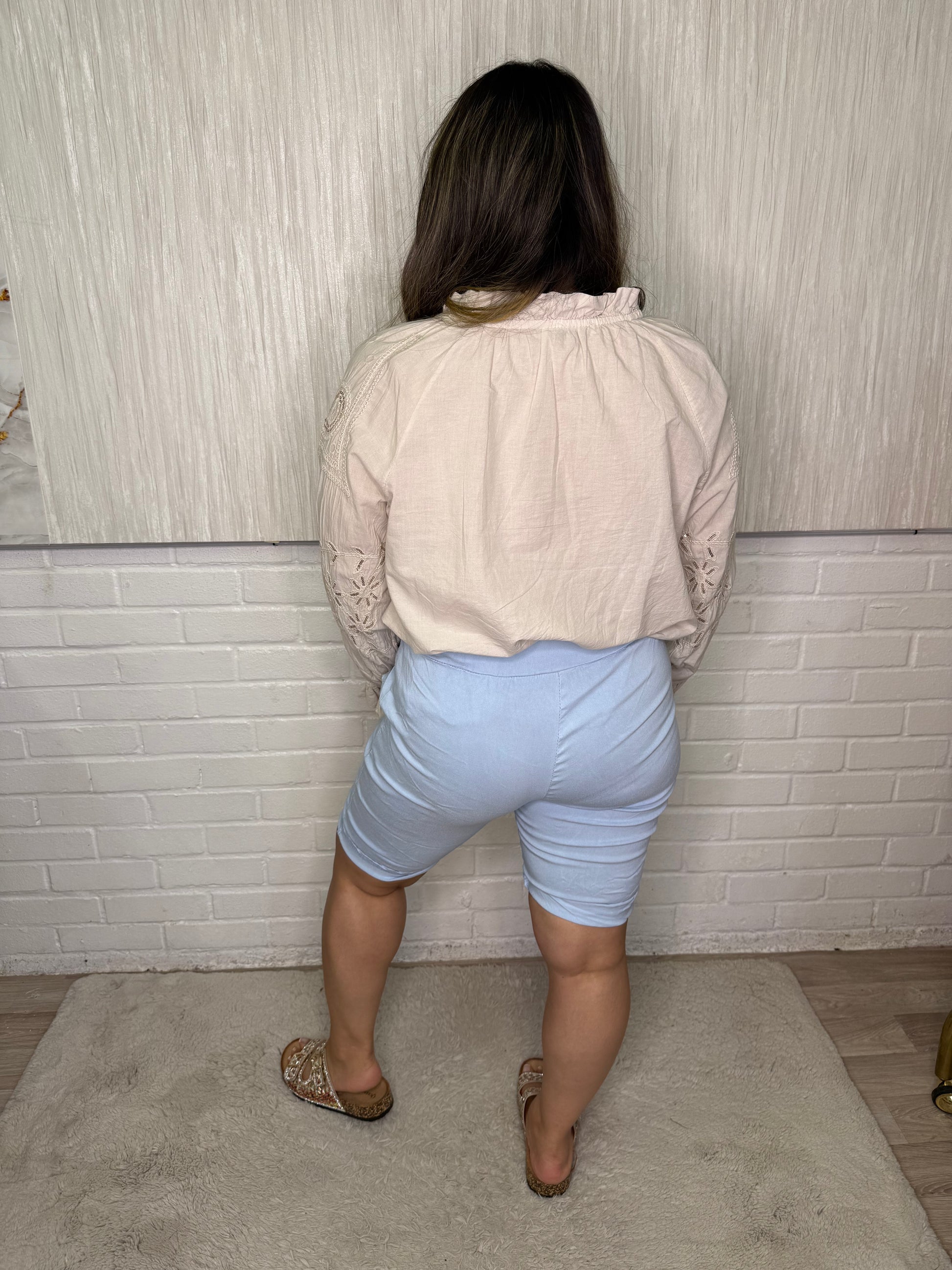 Mid Length Magic ShortsIntroducing Rae, the perfect solution for those who struggle with finding the right fit! Our Mid Length Magic Shorts come in sizes 10-18, ensuring a comfortable fit for a wide range of body types. Say goodbye to ill-fitting shorts and hello to effortless style and comfort.