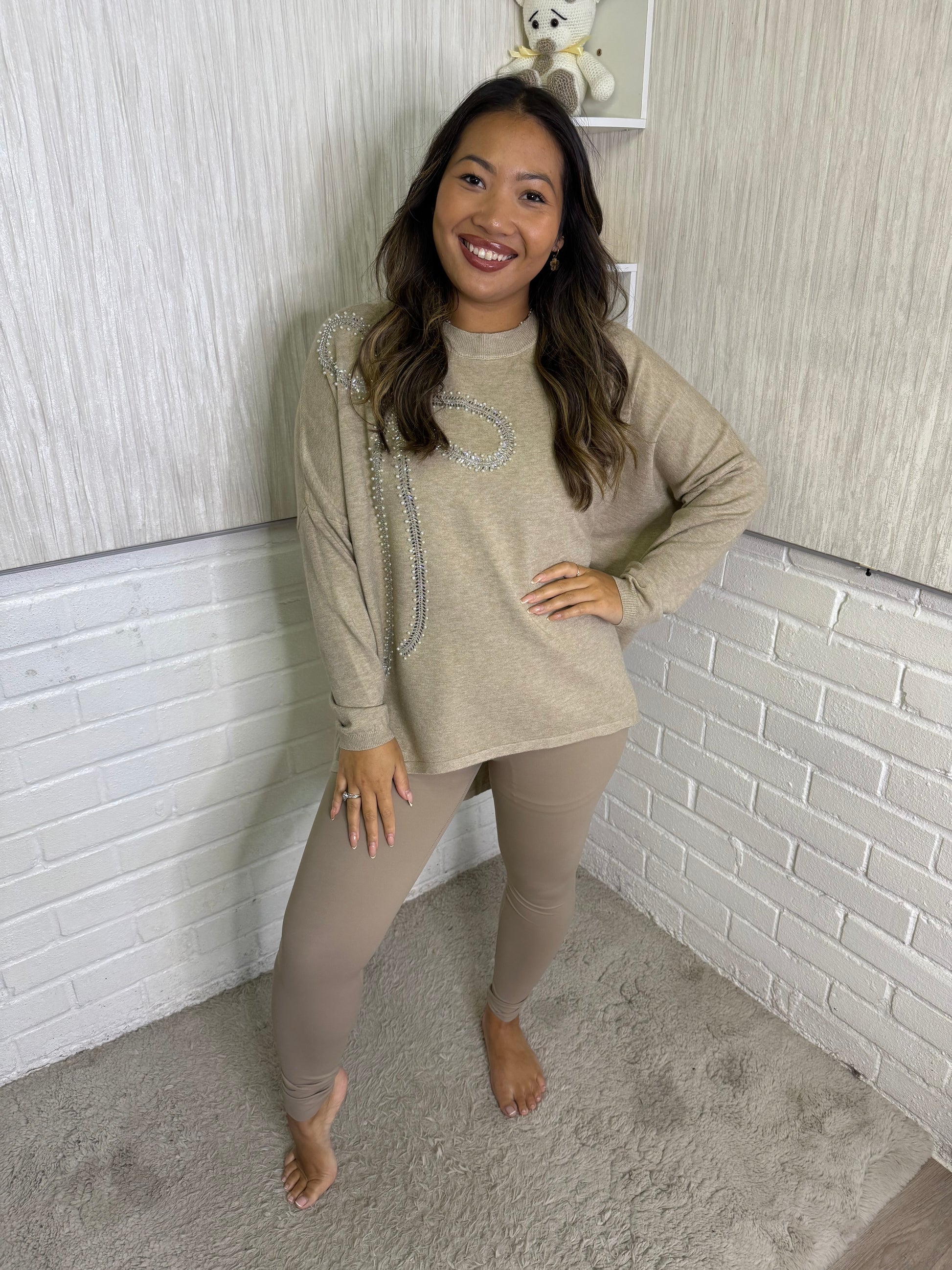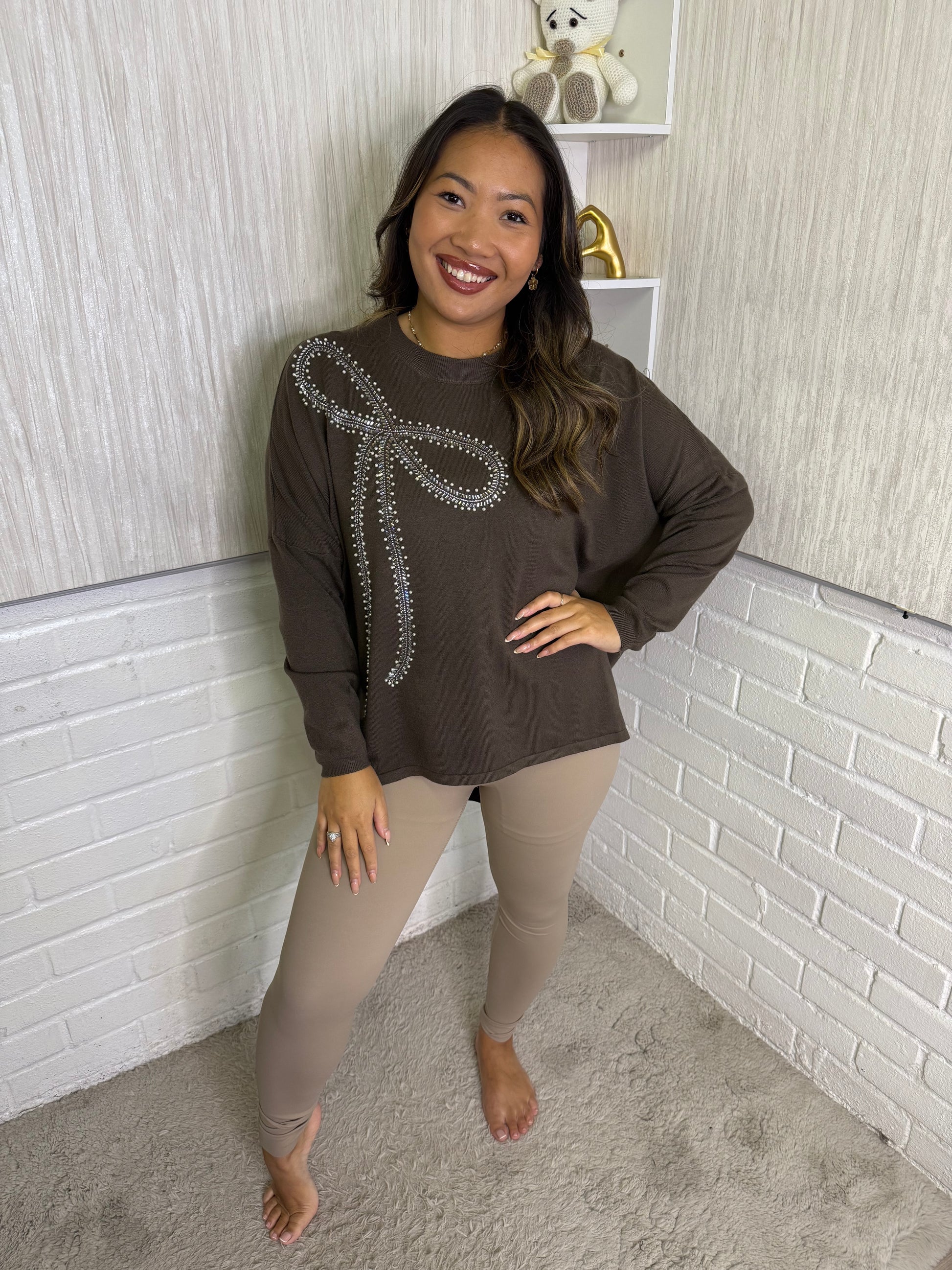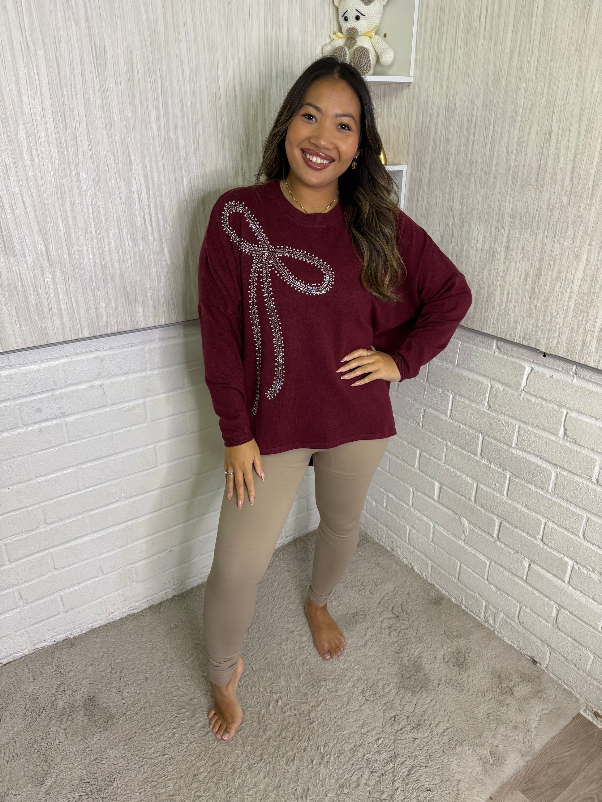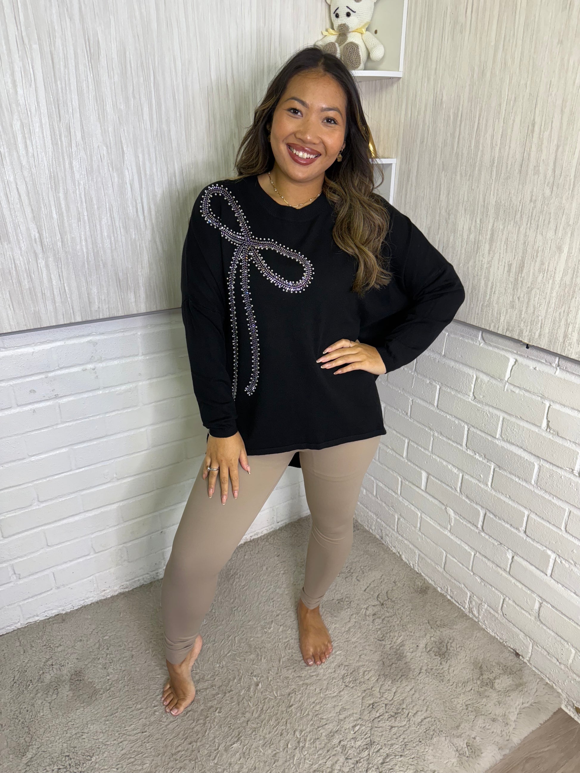 A stunning adorned sweater featuring a bow accent detail pearl and baguette style gems and round rhinestones. Available in one size, fitting up to a size 20/22. Made of 50% viscose, 28% polyester, and 22% nylon. Model is a size 12, standing at 5.2ft